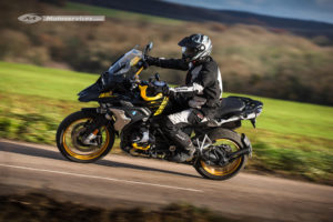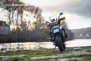 Difficile de faire mieux qu’une R 1250 GS en terme de finition, surtout sur une série spéciale, qui plus est agrémentée d’options, certes pas données, mais à la qualité de fabrication indéniable. La peinture noire fait ressortir à merveille le logo jaune, un sticker vernis qu’on aura du mal à faire sauter même en grattant fort, le guidon et les jantes dorées s’y accordent parfaitement (normalement une bulle et une selle monoplace « et demi » complètent la prestation anniversaire), les couvre-culasses taillées dans la masse Option 719 sont sublimes (en plus de notre option Billet Pack Shadow II avec rétroviseurs, leviers et bocaux de frein et d’embrayage, repose-pieds, sélecteur et pédale de frein). L’écran TFT n’est pas nouveau, mais toujours agréable et fluide à utiliser…